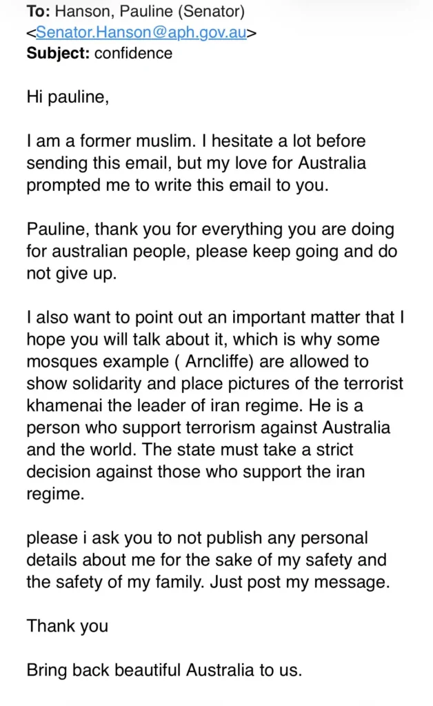 The email, which appeared to be addressed to Hanson’s parliamentary office, claimed to have been written by a “former Muslim” who said they feared retaliation if their identity were revealed.