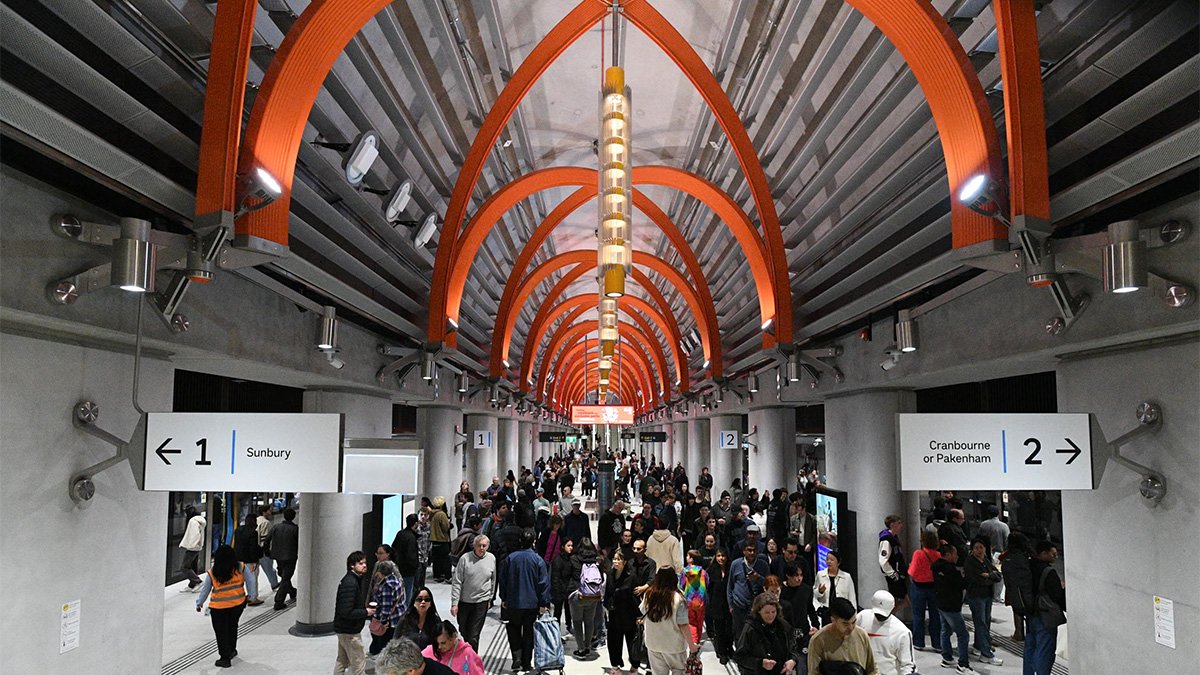 Five new underground stations form part of the project, including State Library station, expanding rail access through the heart of Melbourne.